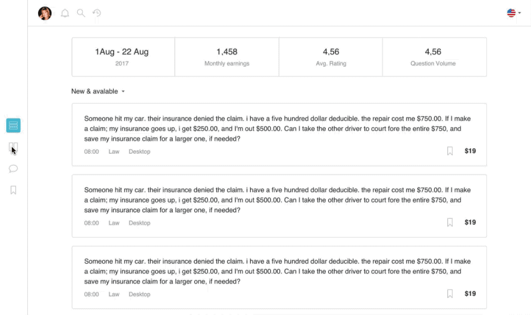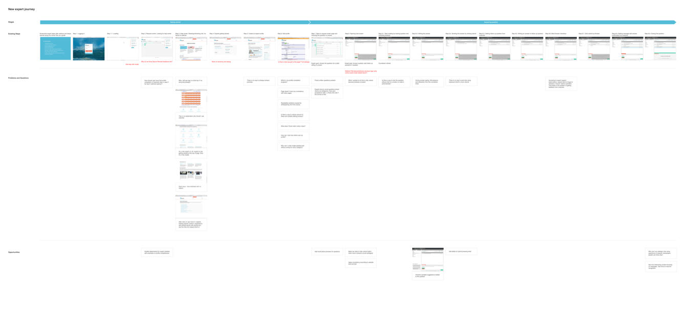 Some research has already been done before I joined the company thus I had at my disposal interview video recordings, interview notes and personas. But I realized that I need to feel experts’ problems on the own skin. That’s why I registered as an expert and tried to answer customers’ questions. Same time I designed a customer journey map to see experts’ problems more clearly and define opportunities for improvement.